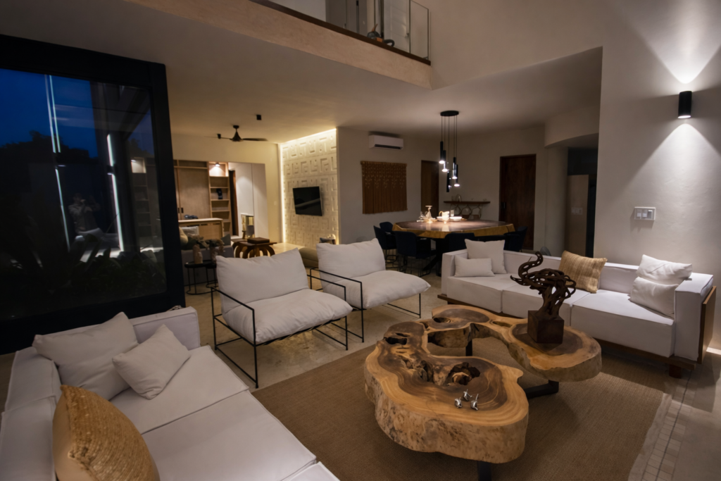 Dado el entorno costero y la alta incidencia de luz natural durante todo el día, el proyecto incorpora una estrategia de iluminación indirecta y cálida, diseñada para generar atmósferas acogedoras y resaltar los elementos arquitectónicos y decorativos clave. El uso de claroscuros y luces tenues permite una transición armónica entre el día y la noche, priorizando el confort visual y la experiencia del usuario en los momentos de mayor uso residencial.